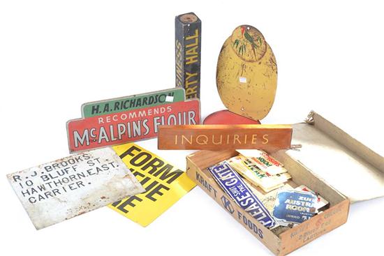 COLLECTION OF SMALL SIGNS MADE FROM METAL, PLASTIC OR WOOD, INCLUDING A ROSELLA ILLUSTRATED STAND IN A KRAFT CHEDDER CHEESE VINATGE BOX, LARGEST SIGN 25CM HIGH X 31CM WIDE (A LOT)