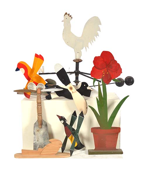 COLLECTION OF WEATHER VANES AND SPINNING WINGS BIRD GARDEN ORNAMENTS, INCLUDING A MUSICAL INDONESIAN WEATHER VANE (LOT)