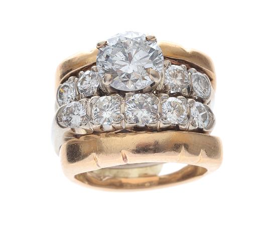 Comprising a five stone diamond ring centred with a round brilliant cut diamond weighing 1.44cts, flanked by two diamonds to either side, together with a conforming five stone diamond band, and a fitted double wedding band, in 14ct gold, independent valuation available, ring size N-M.
