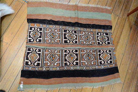 A SMALL GREEN, BLACK AND BROWN RUG