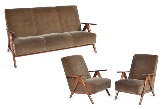 SCHULIM KRIMPER OAK LOUNGE SUITE, CIRCA 1955, COMPRISING OF A THREE SEATER SETTEE AND TWO ARMCHAIRS, UPHOLSTERED IN BROWN CHECK FABRIC, THE SETTEE 162CM LENGTH OF BACK, PROVENANCE- LEONARD JOEL, EUROPEAN AND AUSTRALIAN DECORATIVE ARTS & FINE FURNITURE AUCTION 23 NOVEMBER 2009