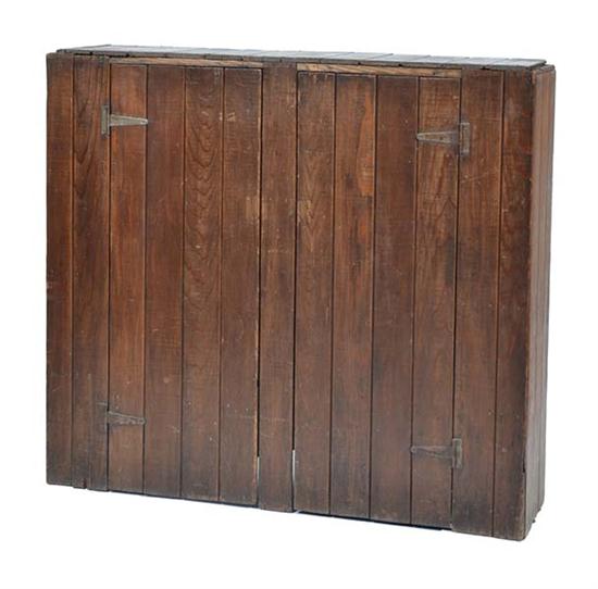 DEPRESSION ERA 1930S WOODEN CHEST MADE FROM FLOOR PANELS, 112CM HIGH X 124CM WIDE X 32CM DEEP