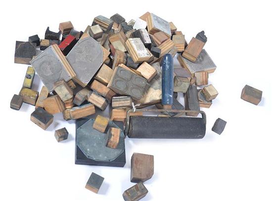 COLLECTION OF ALLOY AND ALUMINIUM STAMPS WITH INK ROLLER (A LOT)