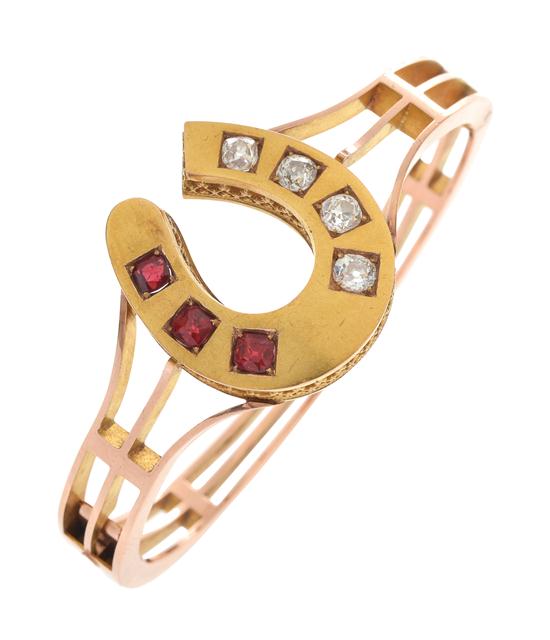 The hinged bangle with central horseshoe feature, set with four old European cut diamonds and red paste, in 15ct gold, marked Evan Jones.