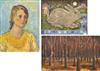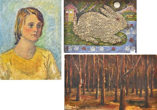 THREE ARTWORKS: I) ARTIST UNKNOWN, PORTRAIT, OIL ON CANVAS II) ARTIST UNKNOWN, RABBIT, BUTTONS, BEADS & ACRYLIC ON BOARD III) JAPANESE SCHOOL, WOODLAND, OIL ON CANVAS (3)