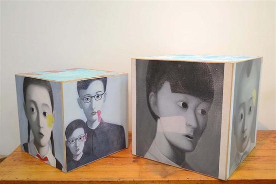 AFTER ZHANG XIAOGANG Two painted cubes depicting family portraits and various scenes