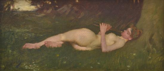 Painted while Hall was still living in London and working as a black and white artist for the illustrated press, Andante depicts an Arcadian scene with a nude nymph classically reclined under a tree playing the double pipe. When exhibited at the Institute of Painters in Oil Colours in London in 1888, it was praised for its beauty of form and accurate draughtsmanship with one critic noting 'to say that it is far and away the best nude in the exhibition is to give a meagre idea of its merit'.[i]