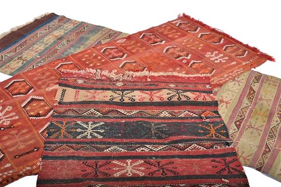 THREE KILIM RUGS, WORN, LARGEST 229CM LONG X 73CM WIDE (3)