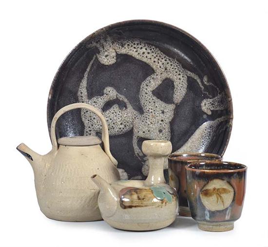 A GROUP OF FIVE GLAZED JAPANESE POTTERY ITEMS INCLUDING A CHARGER BELIEVED TO BE BY NARUI SANS FROM MASHIKO PROVANCE JAPAN (5)
