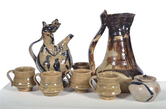 NARUI SANS JAPANESE POTTERY SET FROM MASHIKO PROVINCE TITLED 'HOMAGE TO THE LYREBIRDS IN SHERBROOKE FOREST' INCLUDING A JUG; 5 CUPS; AND SUGAR BOWL (A/F); AND ANOTHER JUG, CIRCA 1970SLARGEST 30CM HIGH (8)