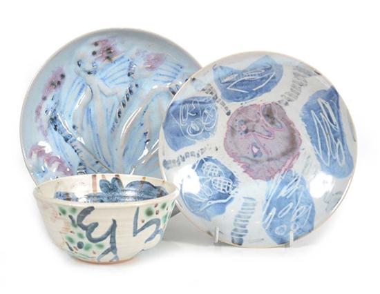 TWO PLATES AND A BOWL BY MURRAY WALKER (BORN 1937), ALL SIGNED AND DATED 1970S-1980S, LARGEST 20CM DIAMETER