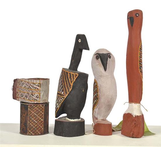 THREE TIWI ISLAND WOODEN BIRD SCULPTURES AND TWO OTHER RELATED PIECES, LARGEST 43CM HIGH (5)