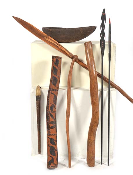 COLLECTION OF WOODEN ABORIGINAL ARTIFACTS INCLUDING A WATER CARRIER (TARNUK); AND PUNISHMENT SPEAR GIVEN TO MURRAY WALKER ON RESEARCH JOURNEY IN SOUTH AUSTRALIAN BORDER COUNTRY 1980 (A LOT)