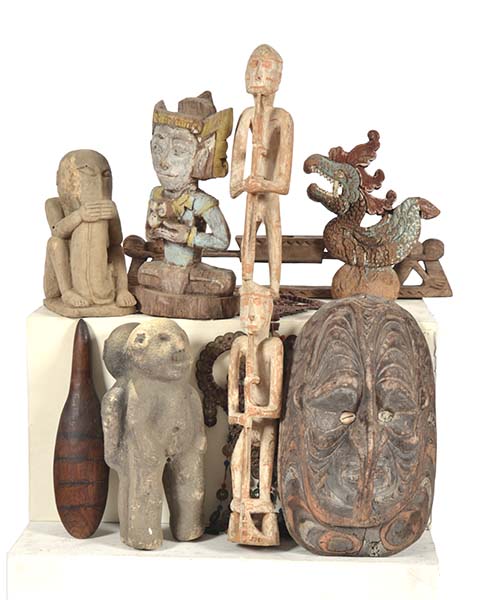 COLLECTION OF BALINESE ARTIFACTS INCLUDING TWO STONE FIGURAL STATUES (A LOT)