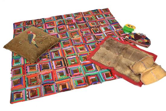 FLORENCE BEATON OF CARWARP 'LOG CABIN' DESIGN QUILT CONSTRUCTED FROM MENS TIES, MADE FOR MURRAY WALKER, CURATOR OF THE 'COLONIAL CRAFT OF VICTORIA EXHIBITION' 1978-79HELDM AT THE NATIONAL GALLERY OF VICTORIA; AND OTHER DEPRESSION STYLE PATCHWORK QUILTS, CUSHIONS, RUGS AND OTHER TEXTILES (A LOT)