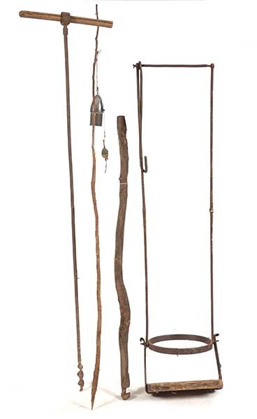 DEPRESSION ERA METAL AND WOOD CHILD'S SWING; A RUDIMENTARY FISHING ROD AND SIMILAR (A LOT)