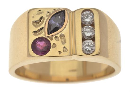 The signet style ring, with rectangular plaque set with a blue marquise cut diamond weighing 0.235cts, a ruby weighing 0.31cts and three round brilliant cut diamonds totalling 0.30cts, in 18ct gold, independent valuation available, ring size X-Y.