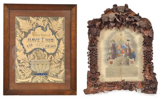 TWO PIECES OF EPHEMERA INCLUDING A LEATHER DECORATED FRAME WITH HAND COLOURED ETCHING CERTIFICATE; AND ONE OTHER, LARGEST 74CM HIGH X 53CM WIDE (2)