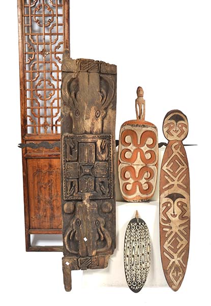 COLLECTION OF DECORATIVE WOOD CARVINGS FROM ASIA INCLUDING CHINA AND BORNEO, LARGEST 261CM HIGH X 43CM WIDE (6)