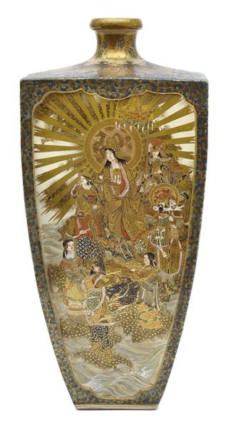 Of square tapered form with four panels featuring Amida Buddha and attendants to one panel, opposing is a Buddhist procession bordered by Karakusa (scrolling grasses) on a gosu blue ground