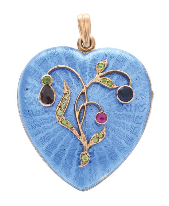 The heart shaped enamelled locket embellished with a gold scroll and coloured gems, in 14ct gold, Russian hallmarks. Circa 1900.