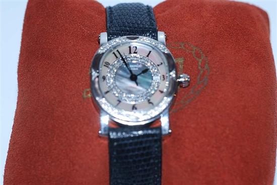 Quartz movement, oval mother of pearl and diamond dial and bezel, date aperture at three, signed case, dial and movement, 18ct white gold navy lizard bands, case length 33mm, with spare purple silk bands.