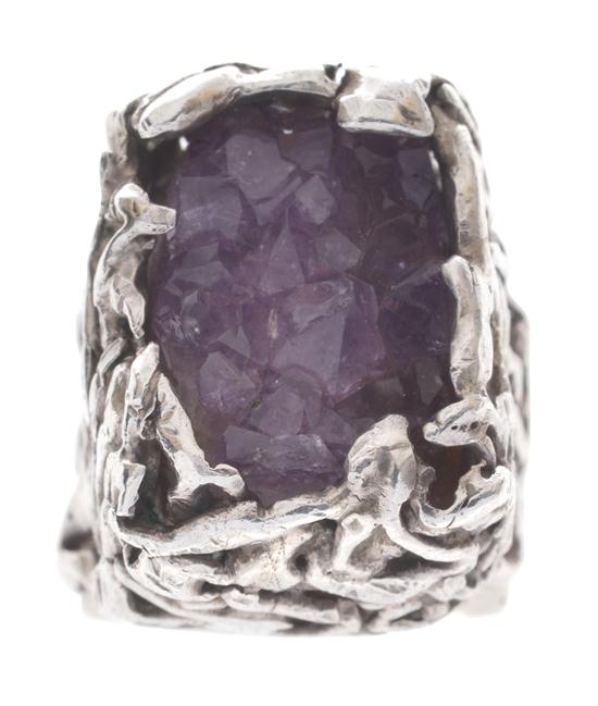 Centrally set with amethyst crystals, in a rectangular textured gallery and shank, in sterling silver, ring size J-K.