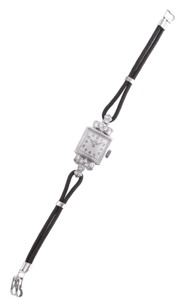 Manual wind movement, square silvered dial with Arabic numerals, signed case, dial and movement, 18ct white gold case with decorative diamond set lugs and cordette bands, case length 15mm.