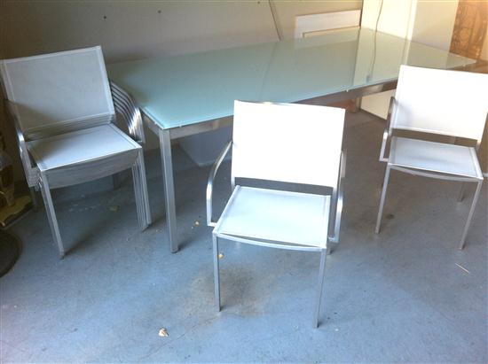 A MODERN ALUMINIUM FRAMED OUTDOOR TABLE WITH A GLASS TOP AND EIGHT MATCHING CHAIRS