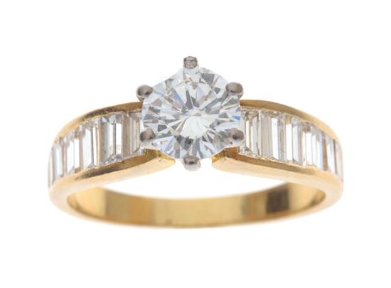 The round brilliant cut diamond weighing 1.10cts, with graduating baguette cut diamond set shoulders, in 18ct gold, independent valuation available, ring size P-Q.