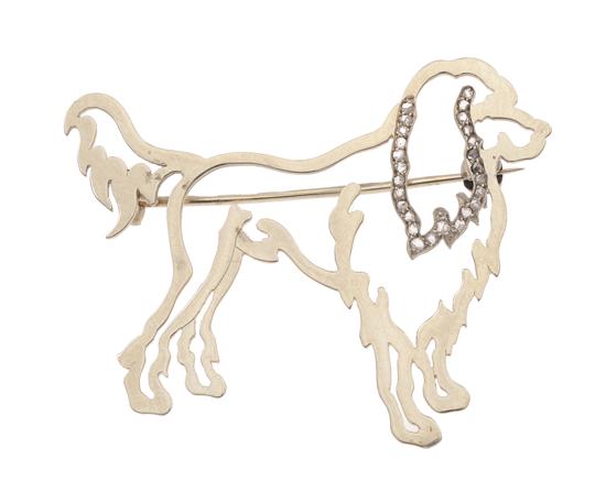 The silhouette design of a dog, with rose cut diamond detail, in 14ct and 18ct white gold.