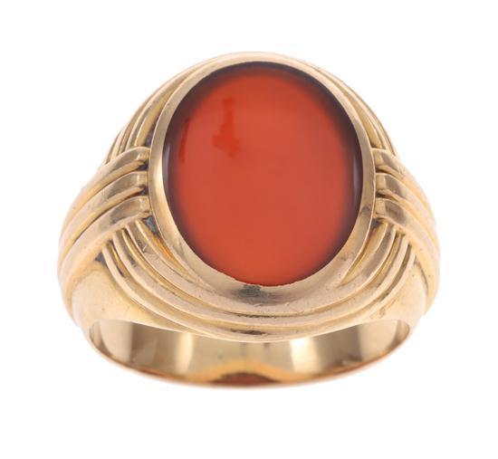 Centrally set with an oval carnelian within a reeded bezel and shoulders, in 14ct gold, ring size R-S.