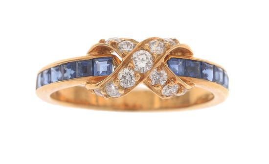 The fine sapphire set band, centred with a diamond set signature 'X', in 18ct gold, ring size J-K.