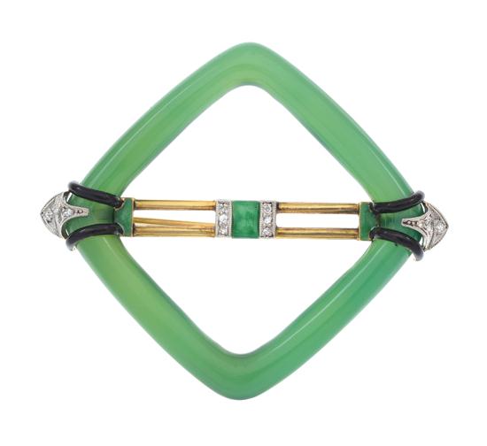 AN ART DECO CHRYSOPRASE, ENAMEL AND DIAMOND BROOCH