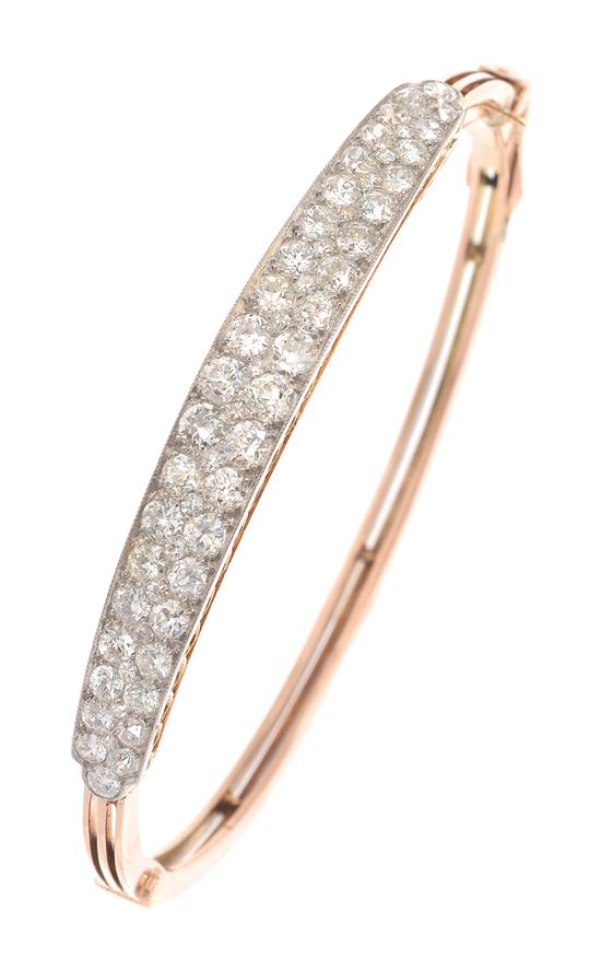 The hinged bangle comprising a double row of old European cut diamonds, in millegrain decoration, in 14ct rose gold.