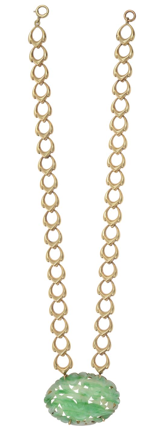 Comprising a carved oval plaque depicting flowers and a bird, suspended on an open link chain in 14ct gold, total length 480mm.