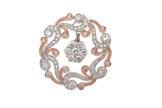 Comprising a central articulated diamond cluster, suspended within scrolls of round brilliant cut diamonds, in millegrain decoration, in two tone 14ct gold.