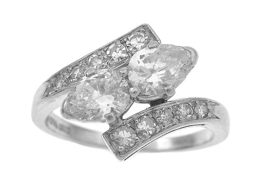 Of crossover design, centred with two pear cut diamonds totalling 0.90cts within upswept shoulders set with single cut diamonds, in platinum, ring size G-H.