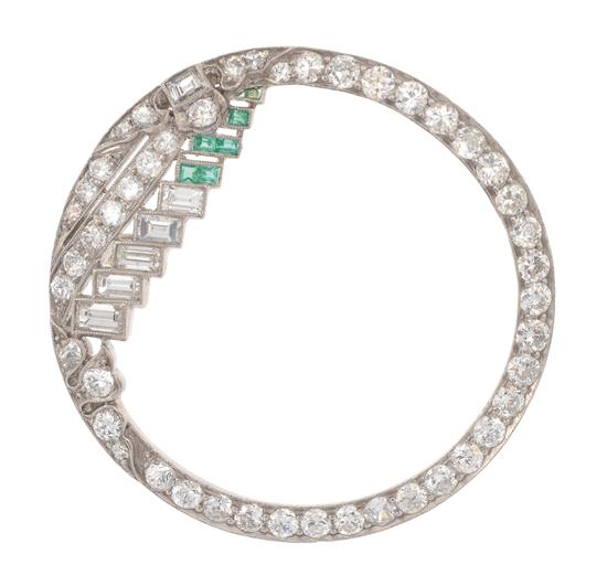 Of open circular form set with round brilliant and baguette cut diamonds, with fine emerald detail, in platinum.