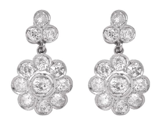 Each earring comprising a floral cluster of old European cut diamonds, suspended below a trefoil of diamonds, to European hook fittings, in 14ct gold.