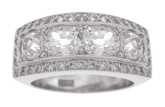 Comprising a central row of four old style vintage cut diamonds totalling 1.62cts, within a border of round brilliant cut diamonds, in millegrain decoration, in 18ct white gold, independent valuation available, ring size L-M.