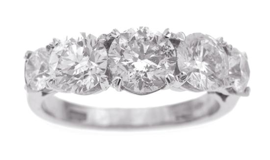 Of half hoop design, comprising five graduating round brilliant cut diamonds totalling 3.38cts, claw set in 18ct white gold, independent valuation available, ring size O-P.
