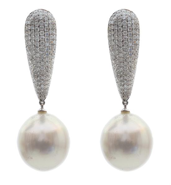A PAIR OF SOUTH SEA PEARL AND DIAMOND EARRINGS