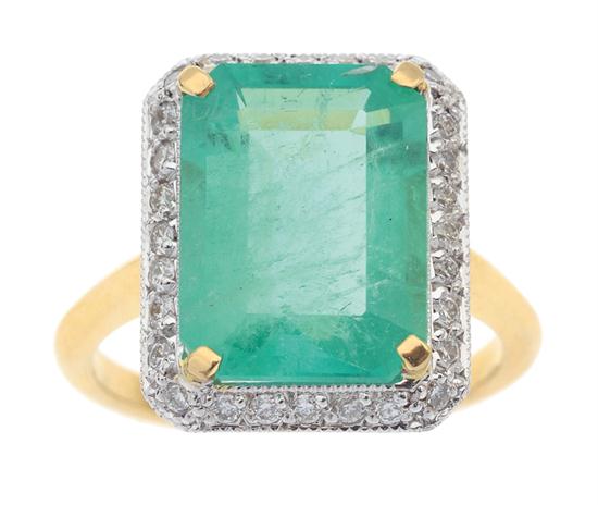 Of cluster design, centrally set with an emerald cut emerald weighing 4.60cts, within a border of round brilliant cut diamonds in millegrain decoration, in 18ct gold, independent valuation available, ring size M-N.