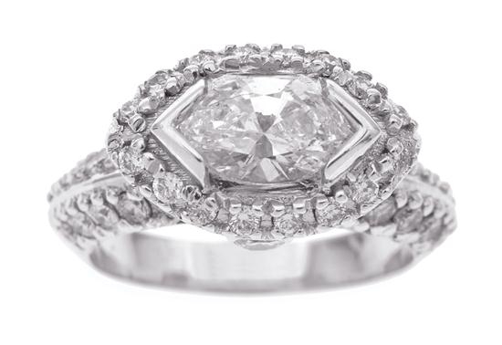 Centrally set with a marquise cut diamond weighing 1.00cts, within a diamond set surround and shoulders, in 18ct white gold, independent valuation available, ring size M-N.