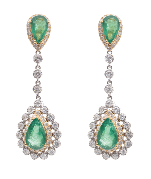 Each earring comprising a pear shaped emerald and diamond cluster suspended below a diamond set drop and conforming stud fitting in two tone 18ct gold, independent valuation available.