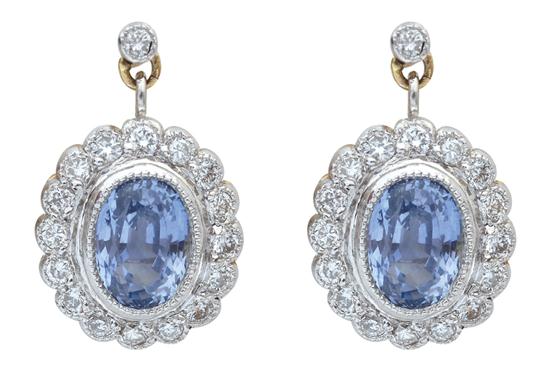 Of cluster design, each earring comprising an oval sapphire within a border of round brilliant cut diamonds in millegrain decoration, suspended below a diamond set stud fitting, in 18ct gold, independent valuation available.