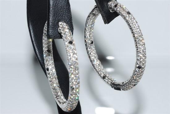 The large hoops comprising three rows of pave set white diamonds with black diamond detail, in 18ct white gold, independent valuation available.