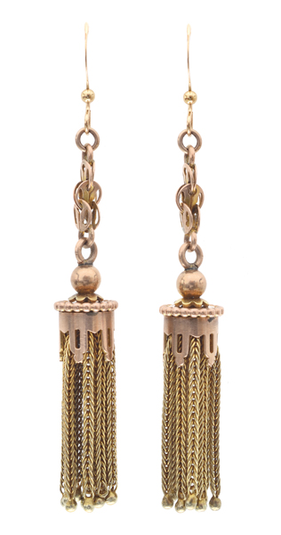 Each earring comprising a fringed tassel suspended on a fancy link drop, with recent shepherd hook fitting, in 9ct gold.