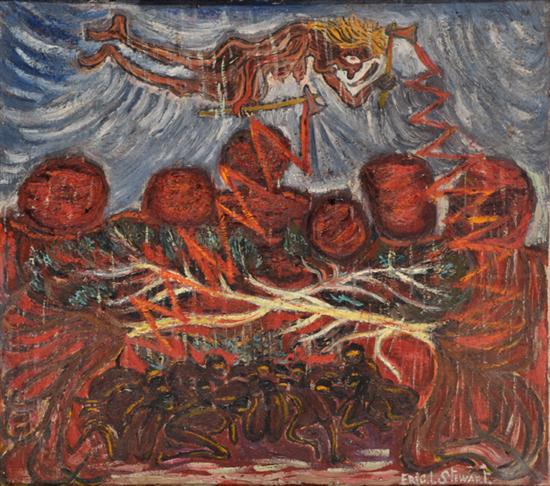 signed 'Eric Stewart' lower right, description verso '-Legend- The aboriginals (sic) believed in a lightning woman aboriginals (sic) sheltering from her by artist:-Eric L. Stewart'